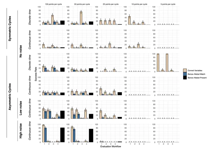 Applications of machine learning in ecology are rapidly expanding. Symbolic regression is gaining particular attention for its success in reverse-engineering human-readable explanatory population models, including the logistic growth and Lotka-Volterra equations, from simulated and laboratory-based population time series. However, field-based populations often lack the characteristics of the idealized time series used in prior assessments. We evaluated the utility of symbolic regression for such time series by quantifying its success for synthetic data varying in sampling density, population cycle asymmetry, process noise, and the erroneous consideration of spurious variables. We further compared two data preprocessing options for estimating population growth rates, and four evaluation workflows for selecting equations. Results indicate that a trade-off between sampling density and process noise primarily drives equation and variable recovery. Symbolic regression failed to recover the underlying equation at sampling densities below 10 points per cycle; however, at higher sampling densities, process noise did increase equation recovery rates. Importantly, although the true model was frequently recovered at sampling densities of 25 or more points per cycle, it was not consistently selected by the evaluation workflows. This discrepancy highlights a need for more robust post-algorithm selection criteria to identify the focal equation among competing candidates.