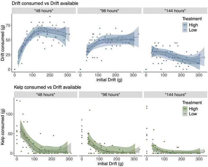 Rocky reef kelp forests can exhibit abrupt shifts between forested and barren states where unchecked sea urchin grazing inhibits kelp recovery. Forefront to urchin barren formation is a behavioral switch where sedentary urchins become active and graze upon attached kelp. This is hypothesized to occur when the availability of drift (i.e., detached kelp on the surface of the reef), which urchins are believed to prefer over intact and attached kelp, declines. Although observed repeatedly, the density-dependent nature of this apparent resource preference has not been characterized quantitatively. We used a series of subtidal functional response experiments in central California, USA, to quantify how consumption rates by Strongylocentrotus purpuratus (purple urchins) on Macrocystis pyrifera (giant kelp) and drift varied with their relative availability and over time as urchins became satiated. Our experiments indicate that the preference for drift over kelp is strong when drift and kelp are at equal abundance, that the abundance of drift has a strong effect on kelp consumption but not vice versa, and that the preferences for drift is indeed density dependent with the qualitative switch to a greater preference for kelp occurring when the availability of drift declines below approximately 1 g of drift for every 82 g of kelp. Our analyses suggest further that maintaining a minimum of approximately 1 g of drift for every 1 g of kelp is sufficient to all but preclude urchins from grazing on live kelp. We recommend these thresholds be used by managers to inform the use of drift subsidies to preserve and restore kelp forests.